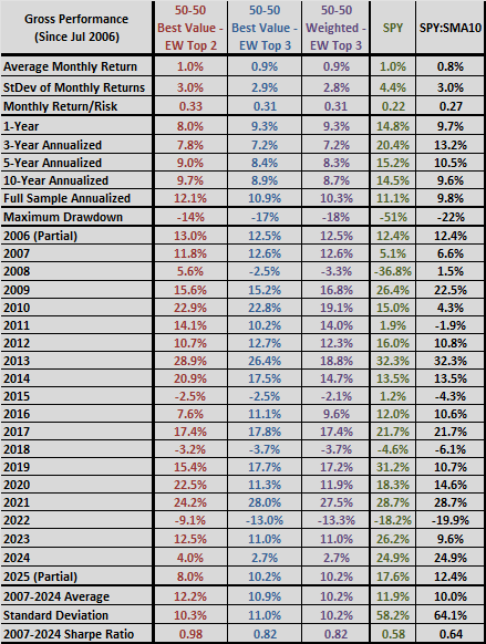 The following chart shows the gross cumulative values of $100,000 initial investments in the Best Value and Weighted portfolios since the end of July 2002 (when all ETFs considered are first available). The chart includes the 60-40 portfolio as a benchmark and buying and holding SPY for reference.