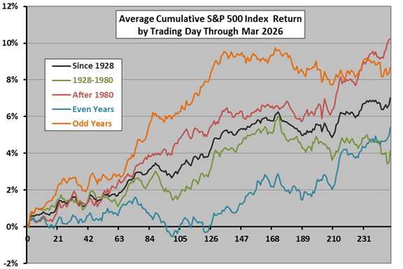 For 1928-2023, the S&P 500 Index has finished in the black during 68% of years. For the first (second) half of the sample period, the index win rate is 60% (75%). For even (odd) years, the index win rate is 67% (69%).
