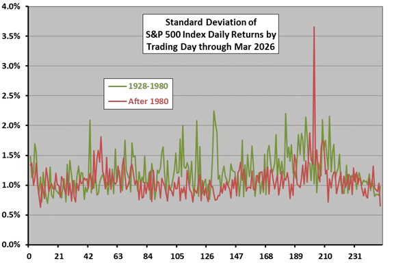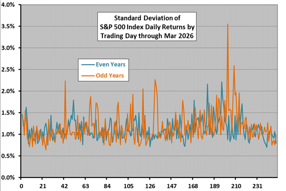 The next two charts show daily volatility profiles for the S&P 500 Index by trading day of the year for two subperiods (upper chart) and for even and odd years (lower chart). The pronounced spike in both charts derives from the October 19, 1987 market crash.