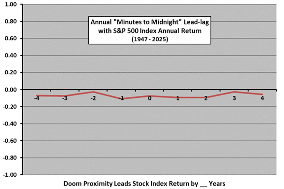 The next chart summarizes annual correlations between annual “Minutes to Midnight” and annual S&P 500 Index return for lead-lag relationships, ranging from S&P 500 Index return leads proximity to doom by four years (-4) to proximity to doom leads S&P 500 Index return by four years (4).