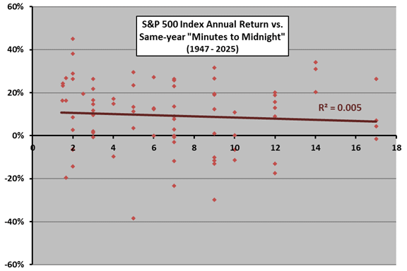 Is proximity to doom good or bad for the U.S. stock market? To measure proximity to doom, we use the Doomsday Clock “Minutes-to-Midnight” metric, revised intermittently in late January via the Bulletin of the Atomic Scientists, which “warns the public about how close we are to destroying our world with dangerous technologies of our own making. It is a metaphor, a reminder of the perils we must address if we are to survive on the planet.” Using the timeline for the Doomsday Clock since inception in 1947 and contemporaneous end-of-year levels of the S&P 500 Index through 2025, we find that: