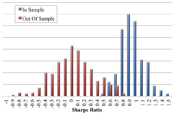 Out of Sample: this distribution of Sharpe ratios derives from 400 simulator trials of the optimized trading strategies with different random number generator seeds (new “return” series). This distribution has a mean Sharpe ratio of about zero, as expected in the absence of sample optimization.
