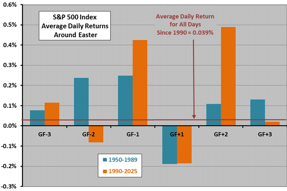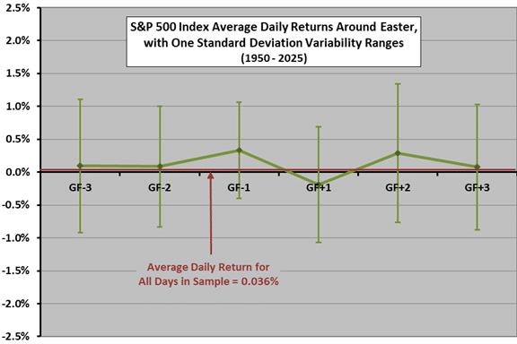 Does the seasonal shift marked by the Easter holiday, with the U.S. stock market closed on the preceding Good Friday, produce anomalous returns? To investigate, we analyze the historical behavior of the S&P 500 Index before and after the holiday. Using daily closing levels of the S&P 500 index for 1950-2025 (76 events), we find that: