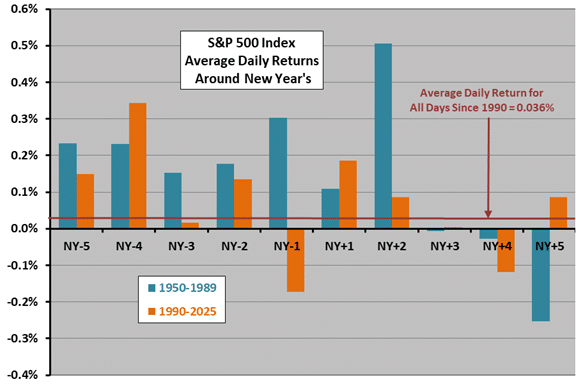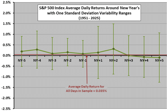Does the New Year’s Day holiday, a time of replanning and income tax positioning, systematically affect investors in a way that translates into U.S. stock market returns? To investigate, we analyze the historical behavior of the S&P 500 Index during the five trading days before and the five trading days after the holiday. Using daily closing levels of the S&P 500 Index around New Year’s Day for 1951-2025 (75 observations), we find that: