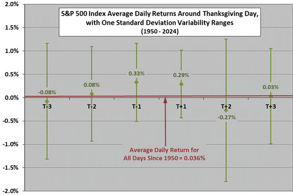 The following chart shows average daily S&P 500 Index returns for the three trading days before (T-3 to T-1) and the three trading days after (T+1 to T+3) Thanksgiving over the full sample period, with one standard deviation variability ranges. The average daily return for all trading days in the sample is 0.036%. Results suggest: