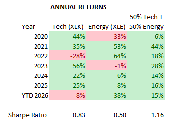 A subscriber forwarded the following chart with summary performances of State Street Energy Select Sector SPDR ETF (XLE), State Street Technology Select Sector SPDR ETF (XLK) and an equal-weighted, annually rebalanced combination of the two and encouraged further investigation. The chart indicates that XLE and XLK are materially diversifying since 2020, but the sample is extremely short and includes unusual COVID-19 and Iran war disruptors.