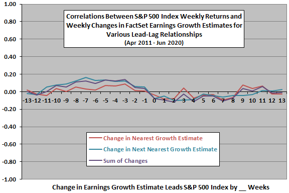 The next chart summarizes lead-lag relationships between weekly S&P 500 Index returns and weekly changes in three series of FactSet earnings growth estimate changes: