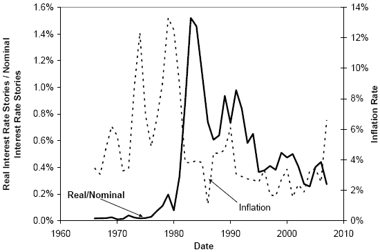 The following chart, taken from the paper, tracks the number of U.S. newspaper articles that mention “real interest rate” as a percentage of articles that mention “interest rate” for each year during 1966-2007, along with the contemporaneous annual inflation rate. While the frequency of references to real rates has always been low, it peaks in loose relationship to the high inflation rate experience of the 1970s. Since then, attention to real rates decays rapidly.