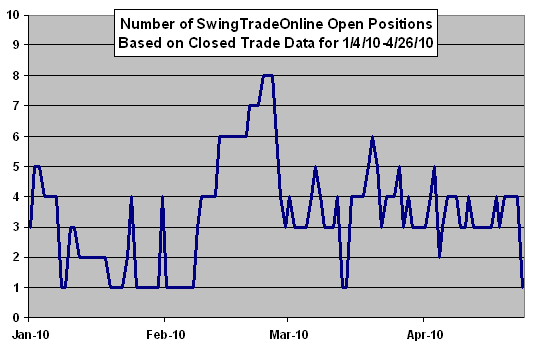 Note further that SwingTradeOnline does not state the assumptions about portfolio position management (percentage of portfolio allocated to each trade) used to calculate claimed total return performance. The following chart plots the number of SwingTradeOnline open positions derived from the detailed closed position data for 1/4/10-4/26/10. Based on this modest sample, a subscriber must plan for at least eight concurrent positions to participate in all trades, with the overall portfolio therefore mostly in cash much of the time. Only with perfect hindsight could the subscriber capture full per-trade returns at the portfolio level.