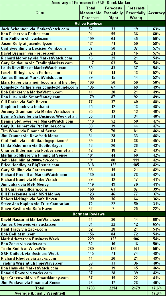 See Guru Grades for a snapshot of the accuracy of various experts in predicting the direction of the U.S. stock market, including links to evaluations of the commentaries of other individual market pundits and gurus.