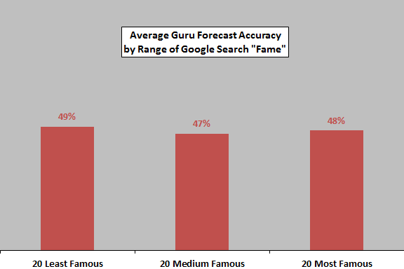 For a third perspective, the fame-weighted average accuracy of all 60 gurus is 46.4%, compared to a raw average of 48.0%. Given the sample size, these averages are not materially different.