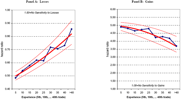 The following charts, extracted from the paper, illustrate how both aspects of the disposition effect attenuate with increased trading experience. Trading experience is the cumulative number of trades executed by an investor. Hazard ratio indicates how willing investors are to sell. A hazard ratio of zero means complete unwillingness. A ratio of one means no unusual unwillingness. A ratio greater than one indicates eagerness to sell.