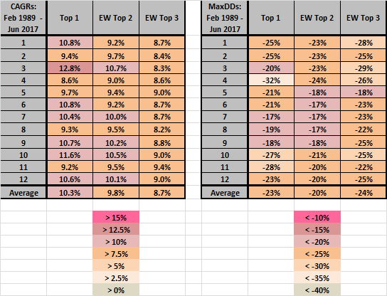 The following color-coded tables compare compound annual growth rates (CAGR) and maximum drawdowns (MaxDD) of Top 1, EW Top 2 and EW Top 3 portfolios over the sample period for lookback intervals ranging from one to 12 months (left column of each table). First monthly returns used are for February 1989 to accommodate the longest lookback interval. Notable points are: