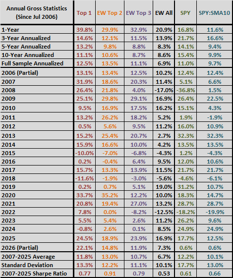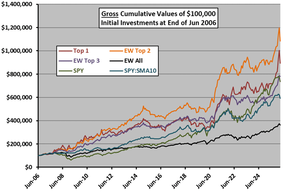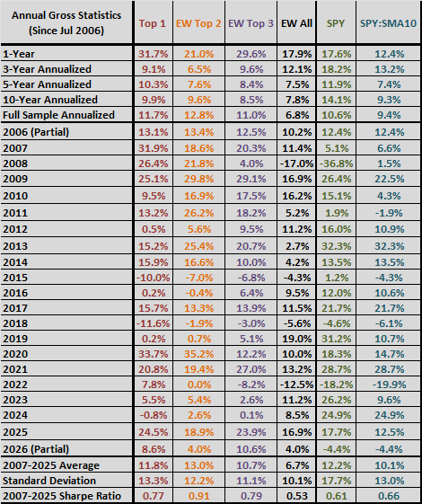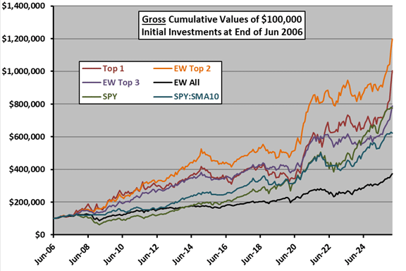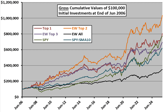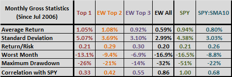 The following chart shows the gross cumulative values of $100,000 initial investments in SACEMS Top 1, EW Top 2 and EW Top 3 since the end of June 2006 (based on availability of ETF data). The chart includes three benchmarks: (1) an equally weighted, monthly rebalanced portfolio of all ETFs in the SACEMS universe (EW All), indicative of simple diversification; (2) buying and holding SPDR S&P 500 (SPY); and, (3) SPY:SMA10, a simple timing strategy that holds SPY (Cash) when the S&P 500 Index is above (below) its 10-month simple moving average.