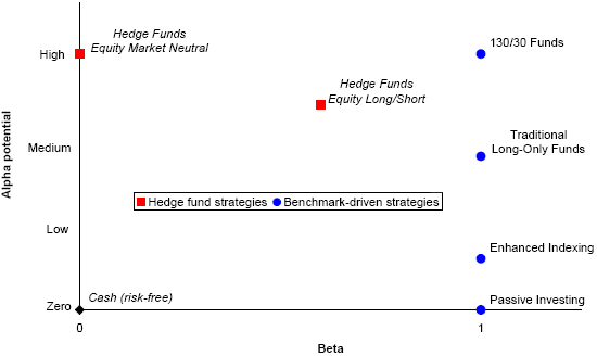 - 130/30 equity funds are more like traditional mutual funds (measured to a benchmark) than hedge funds (measured to absolute return). See the figure below.