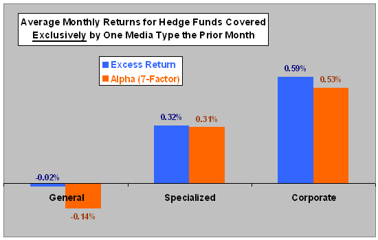 The following chart, constructed from data in the paper, summarizes average (equally weighted) monthly returns for groups of hedge funds formed each month based on exclusive coverage by each of the three media types the prior month. Returns by media type are similar whether measured simply in excess of the risk-free rate or adjusted for multiple risk factors common to long/short U.S. equity hedge funds.