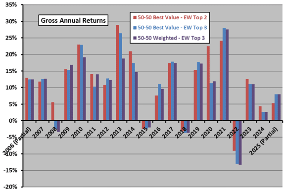 - Compound annual growth rates (CAGR) are 12.0%, 10.8%, 10.2% and 10.0% for 50-50 Best Value - EW Top 2, 50-50 Best Value- EW Top 3, 50-50 Weighted - EW Top 3 and SPY:SMA10, respectively.