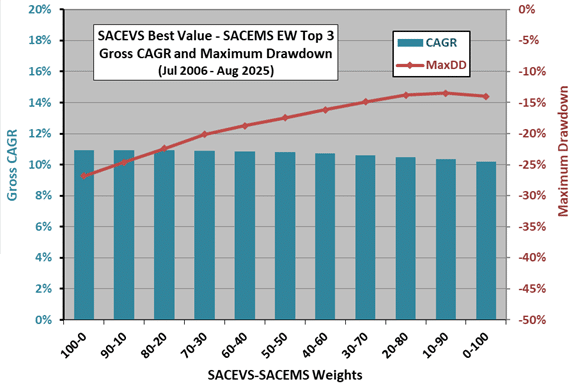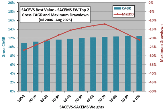 The next chart summarizes CAGR and MaxDD sensitivities to Best Value - EW Top 2 weights, ranging from 100% allocation to SACEVS Best Value (100-0) to 100% allocation to SACEMS EW Top 2 (0-100). Results suggest that a tilt toward SACEMS EW Top 2 is optimal, but the sample period is short for this level of discrimination.