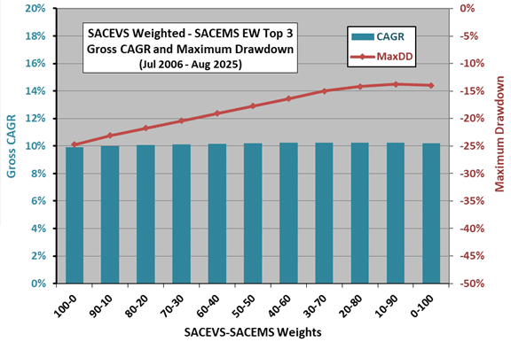 The final chart summarizes CAGR and MaxDD sensitivities to SACEVS Weighted and SACEMS EW Top 3 weights, ranging from 100% allocation to SACEVS Weighted (100-0) to 100% allocation to SACEMS EW Top 3 (0-100). Results suggest that a tilt toward SACEMS EW Top 3 is optimal, but again the sample period is short for this level of discrimination.