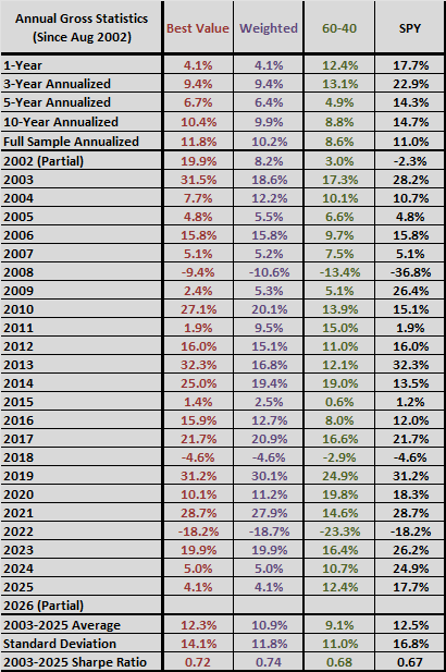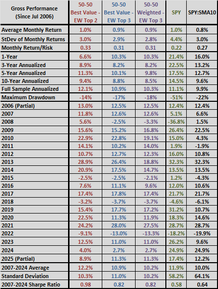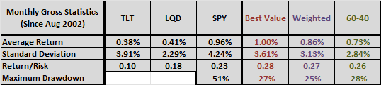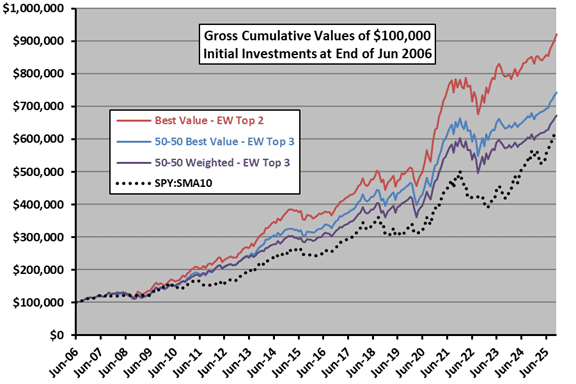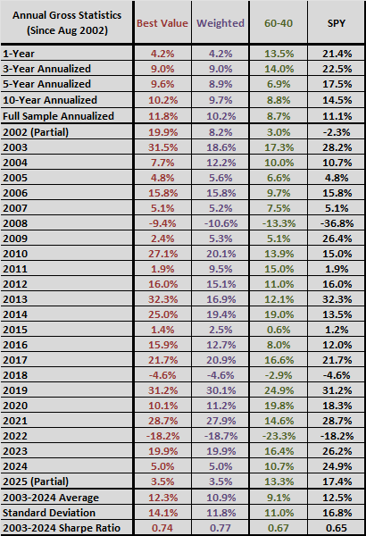 The following chart shows the gross cumulative values of $100,000 initial investments in the Best Value and Weighted portfolios since the end of July 2002 (when all ETFs considered are first available). The chart includes the 60-40 portfolio as a benchmark and buying and holding SPY for reference.