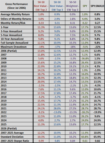 - 50-50 Best Value – EW Top 2: SACEVS Best Value paired with SACEMS Equally Weighted (EW) Top 2 (aggressive value and somewhat aggressive momentum).