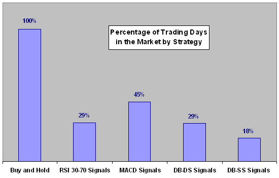 Results suggest that combining RSI and MACD signals does not enhance returns. The average daily return while in stocks for the DB-DS strategy falls between those of the RSI strategy and the MACD strategy. The average daily return while in stocks for the DB-SS strategy is lower than both those for the single-signal strategies.