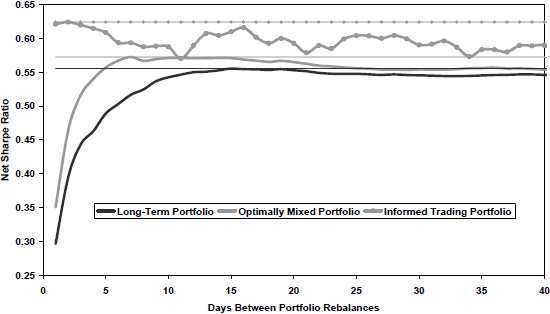 The assumed trading friction for all three portfolios is 0.10% one way. The chart shows that the trading frequency that maximizes net Sharpe ratio differs among the strategies, and that the informed trading approach wins at nearly all trading frequencies.