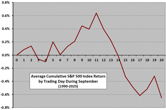 The following chart shows the average month-to-date percentage change in the S&P 500 index by trading day during September from 1990 through 2025. Day 0 represents the August close. We insert four dummy trading days after 9/10/01 with the same close as 9/10/01 to avoid calendar misalignment for the balance of the month. The index has typically drifted higher during the first half of September and then reversed to loss during the second half of the month. We have not used data for trading day 21, because most Septembers do not have 21 trading days. Also, sample size is only 31-36 for specific trading days, so these results are only mildly suggestive rather than predictive. For 1990-2025, 19 Septembers have been winners and 17 losers.