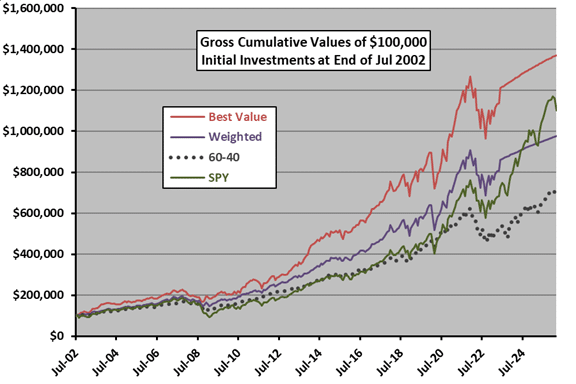 The following chart shows the gross cumulative values of $100,000 initial investments in the Best Value and Weighted portfolios since the end of July 2002 (when all ETFs considered are first available). The chart includes the 60-40 portfolio as a benchmark and buying and holding SPY for reference.