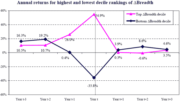 The following figure illustrates the first two of the above points, showing that a large positive (negative) change in the breadth of institutional holding relates to high (low) returns over the past two years. It also show that these unusual past returns revert (even reverse) the next couple of years.