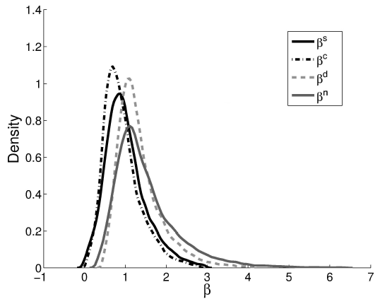 The following chart, taken from the paper, compares distributions of the four betas averaged across stocks and over time, as follows: